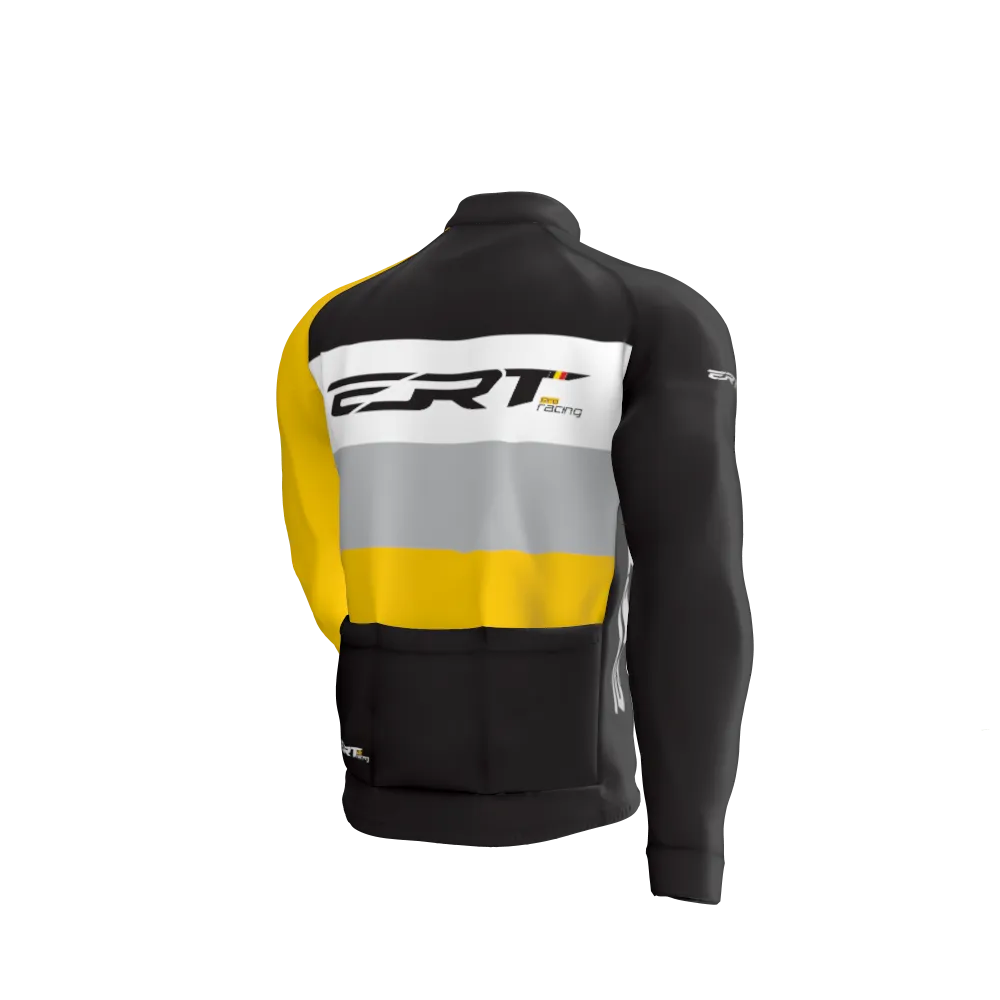 • Casaco de ciclismo preto, cinza e amarelo com logotipo ERT racing nas costas