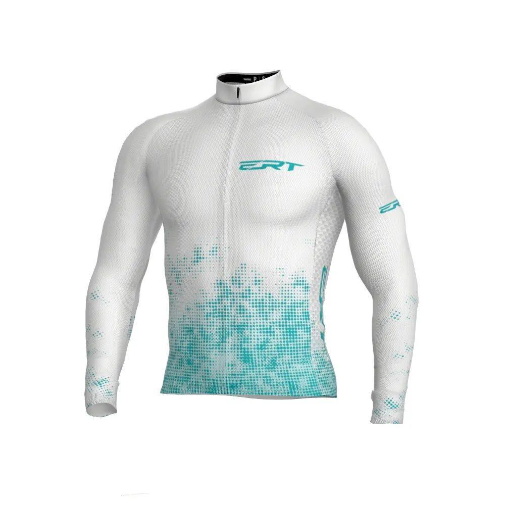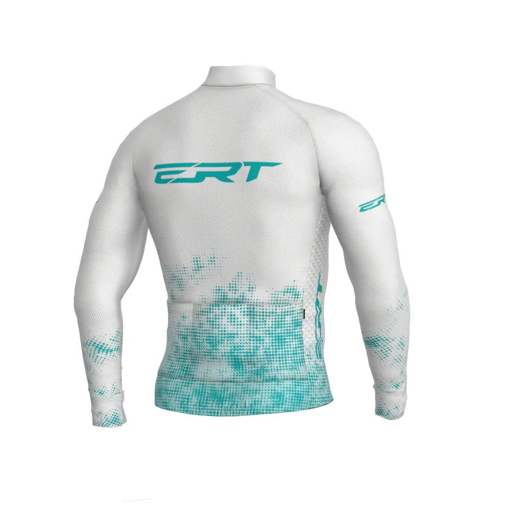 • Camisola de ciclismo branca com logótipo ERT azul turquesa e detalhes pixelizados
