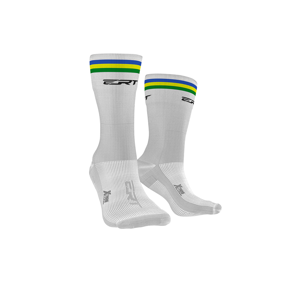 Meias desportivas brancas com riscas coloridas e texto ERT