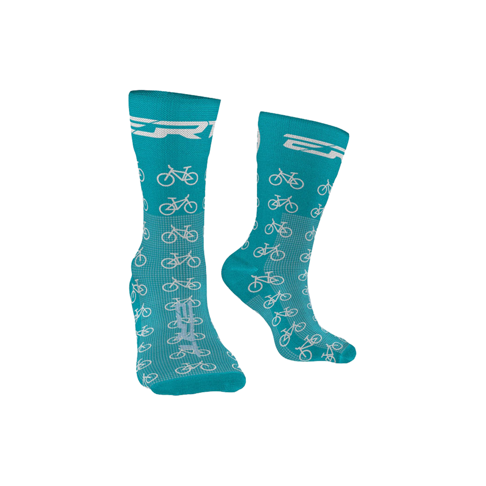 Meias azuis turquesa com padrão de bicicletas brancas e texto 'SR' na parte superior